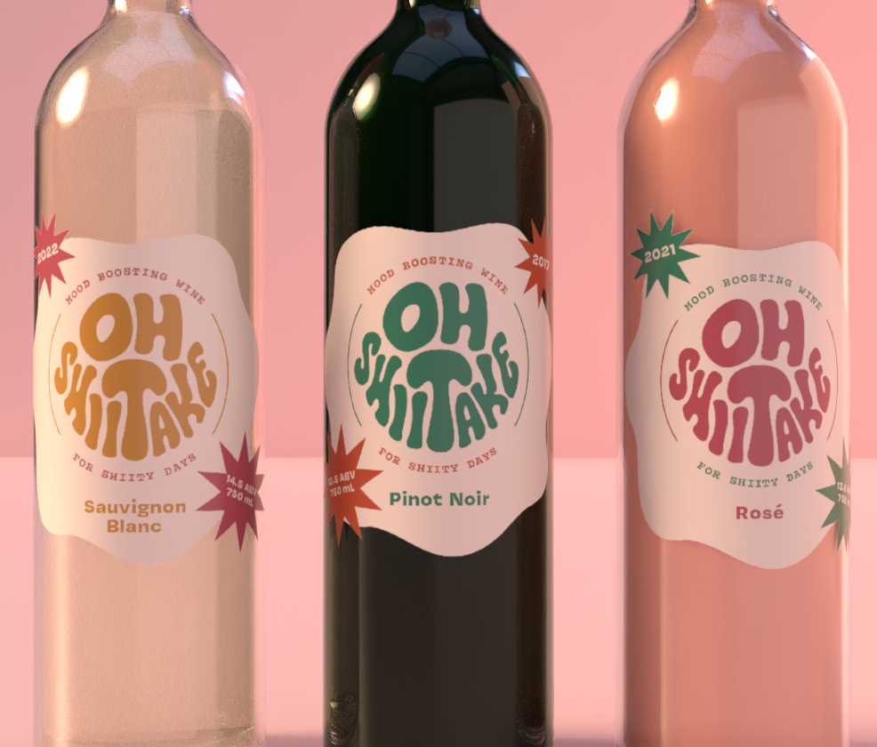 The slogan “Good Adaptogenic Wine for Shiity Days” encapsulates the fun, relaxed, and funky mood of Oh Shiitake. Oh Shiitake is a fictional wine gift box that includes adaptogenic mushroom-infused Sauvignon Blanc, Pinot Noir, and Rosé. Adaptogenic mushrooms are mushrooms that may help reduce the effects of stress on your body. They do not contain hallucinogens, but rather adaptogens, which are substances that increase the body’s resistance to physical, biological, and chemical stress. Therefore, Oh Shiitake offers wine that not only tastes delicious, but helps relieve the body of negative energy and stress after long days!